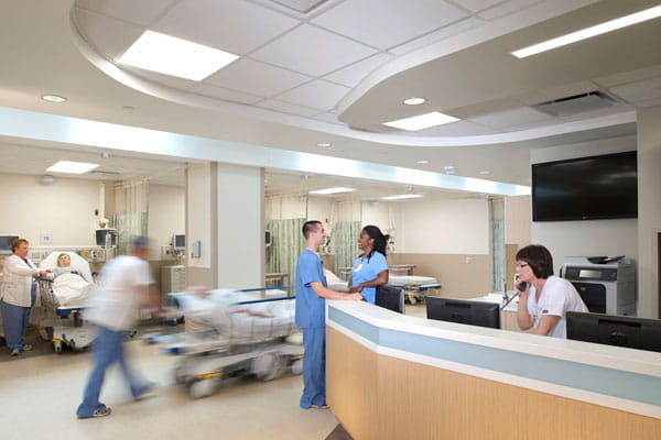 UPMC East main entrance Pre and Post-Operative Care Unit Point of Care Testing Cafe Patient Room Emergency Department Computerized Tomography (CT Scanner) Operating Rooms Cath Lab Endoscopy Suite Pharmacy Robot LINAC