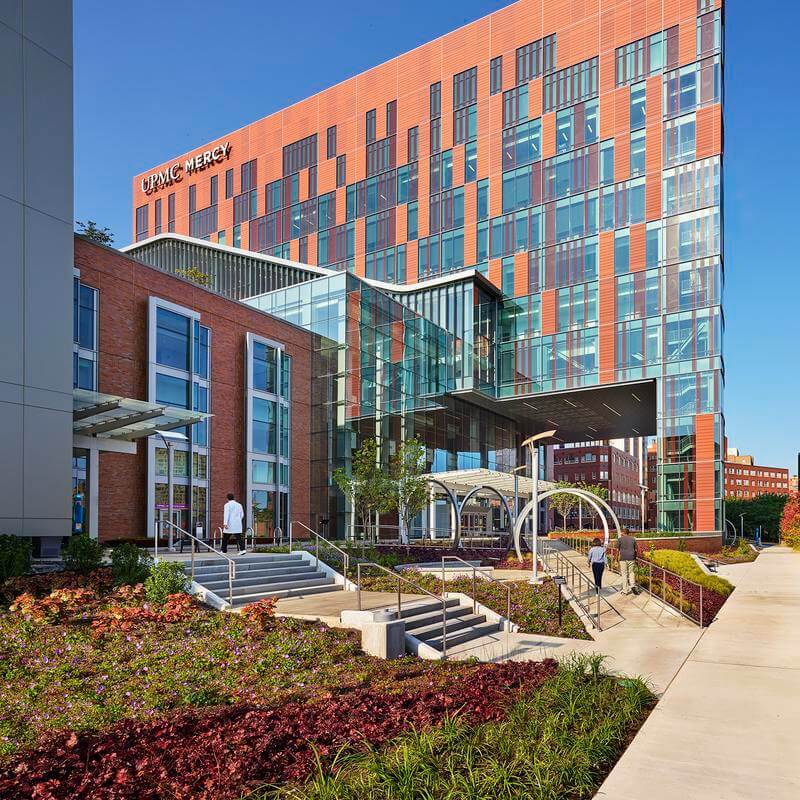 Construction of the new UPMC Mercy Pavilion building. Construction of the new UPMC Mercy Pavilion building. Construction of the new UPMC Mercy Pavilion building. Construction of the new UPMC Mercy Pavilion building. Construction of the new UPMC Mercy Pavilion building. Construction of the new UPMC Mercy Pavilion building.  UPMC Mercy Pavilion’s main entrance from Locust Street.  UPMC Mercy Pavilion’s rooftop, including staff and patient gardens and the collaborative staircase. UPMC Mercy Pavilion’s West Atrium serves as the main entrance for the UPMC Vision Institute. The UPMC Optical Shop, located on the ground floor at UPMC Mercy Pavilion.  A UPMC Vision Institute patient exam room on the pavilion’s second floor. UPMC Mercy Pavilion’s collaborative staircase, a glass structure with seating areas for informal meetings.   The UPMC Vision Institute and UPMC Rehabilitation Institute’s shared waiting area on the pavilion’s fourth floor features turn II, an interactive art installation. The UPMC Rehabilitation Institute’s pavilion location includes 10 exam rooms. UPMC Mercy Pavilion’s East Atrium features Storybank, an art installation with more than 700 found glass bottles that include messages and mementos from patients, staff, and our community. UPMC Mercy Pavilion’s eighth floor features the sky lobby, a collaborative space for staff overlooking the Monongahela River. UPMC Mercy Pavilion features a 1,325 square foot rehabilitation gym.