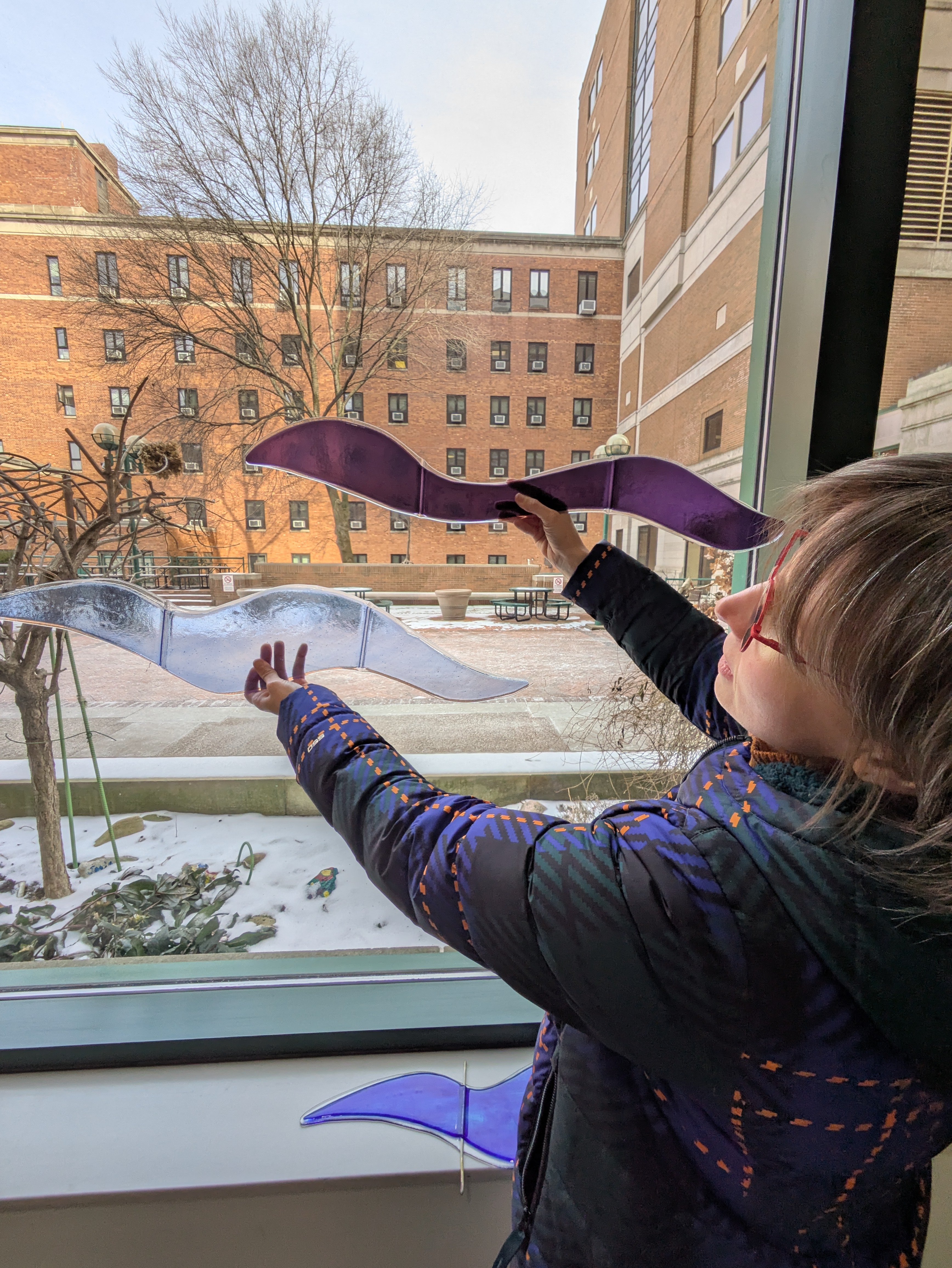 The artist created each glass shape at the Pittsburgh Glass Center, located a few miles away from the hospital. Each “wave” is made from two pieces of glass fused together in a kiln - one clear, and one color.