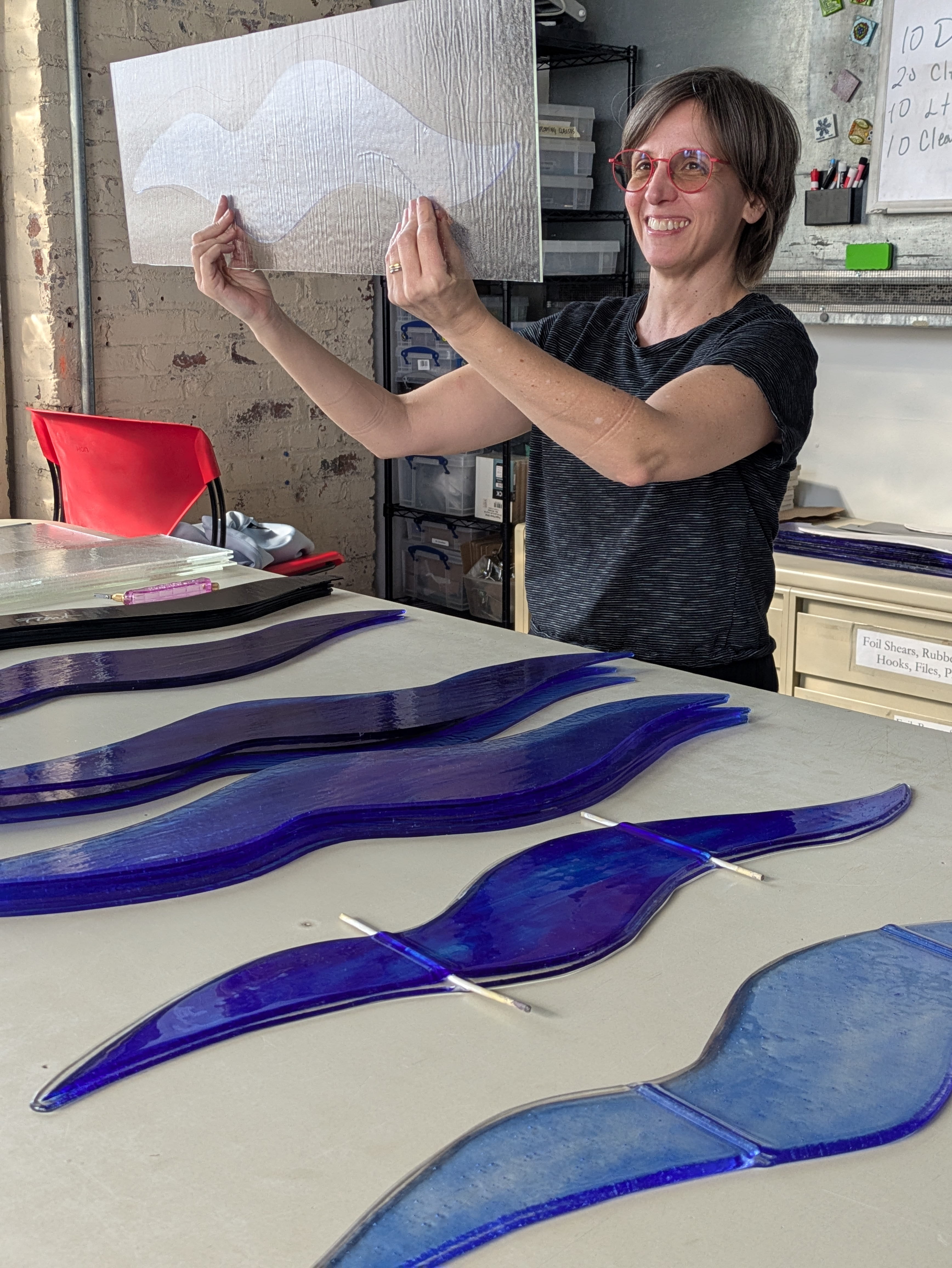 The artist made each piece of glass in the kiln shop at the Pittsburgh Glass Center. She sourced sheets of colored glass from Wissmach Glass, a longtime glass fabricator based in West Virginia. Each wave-shaped piece was hand-cut, carefully layered, and then kiln-fired at 1400°F. The intense heat fused the layers into a single form.