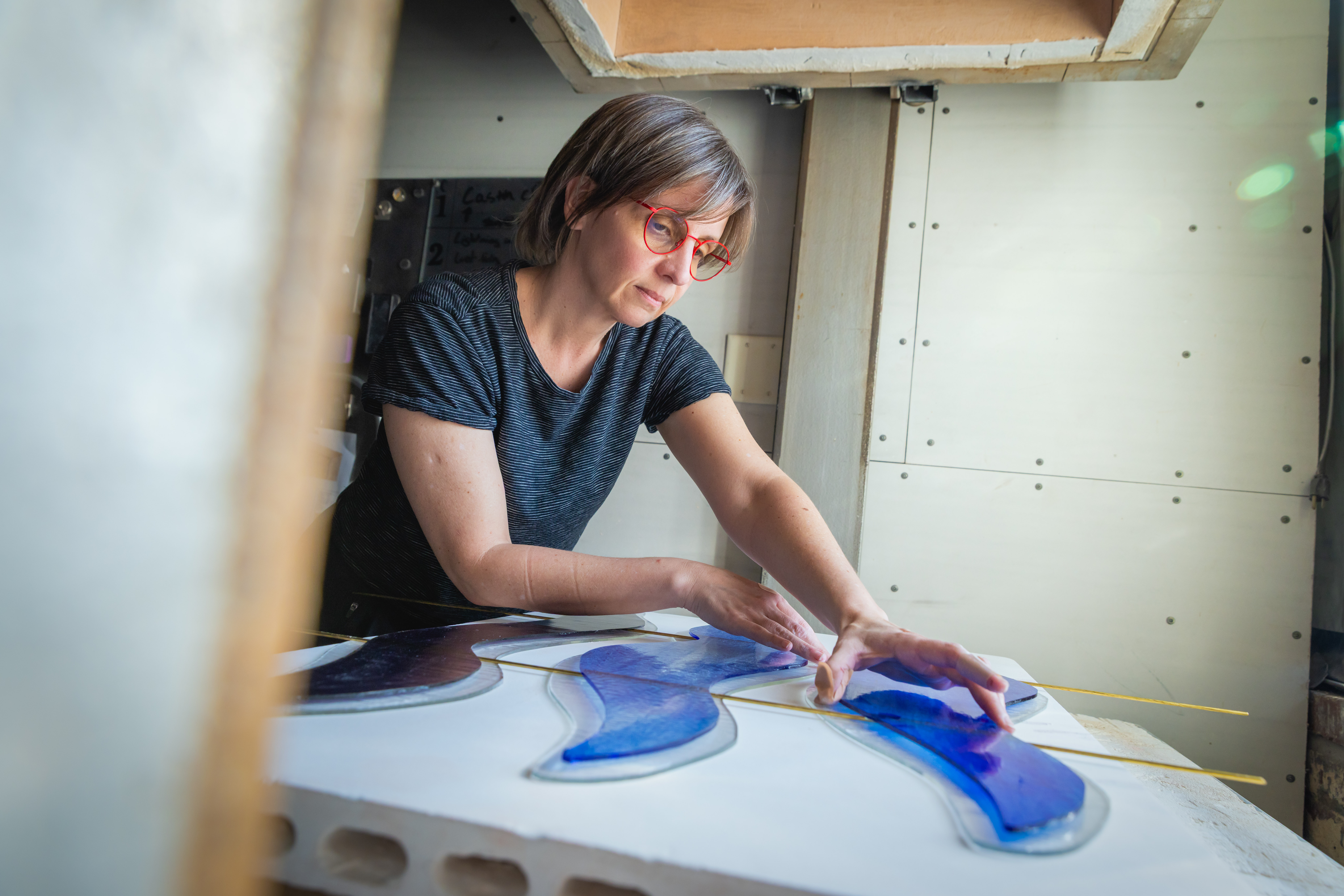 To suspend the sculpture, the artist needed to make channels for the cables to pass through. In this image, you can see her placing metal forms between the glass panels before they are fused in the kiln. When the glass was cooled, she removed the metal to reveal the spaces for the cables. Photo by Elan Mizrahi.