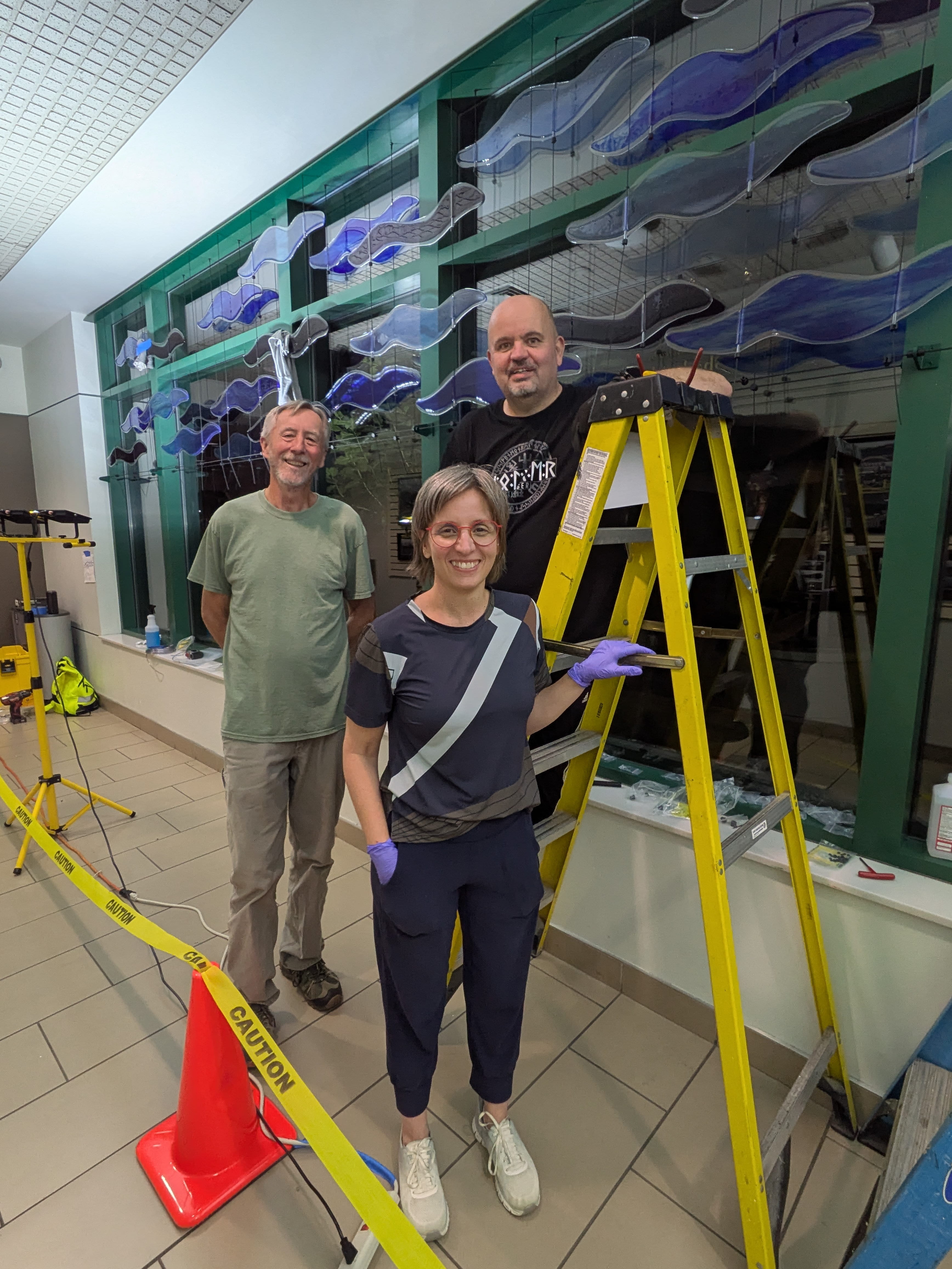 The artist designed this suspended sculpture to fit perfectly within the existing window frames in the west entry. As people move through the corridor, they experience the flow and shifting colors of the artwork.
