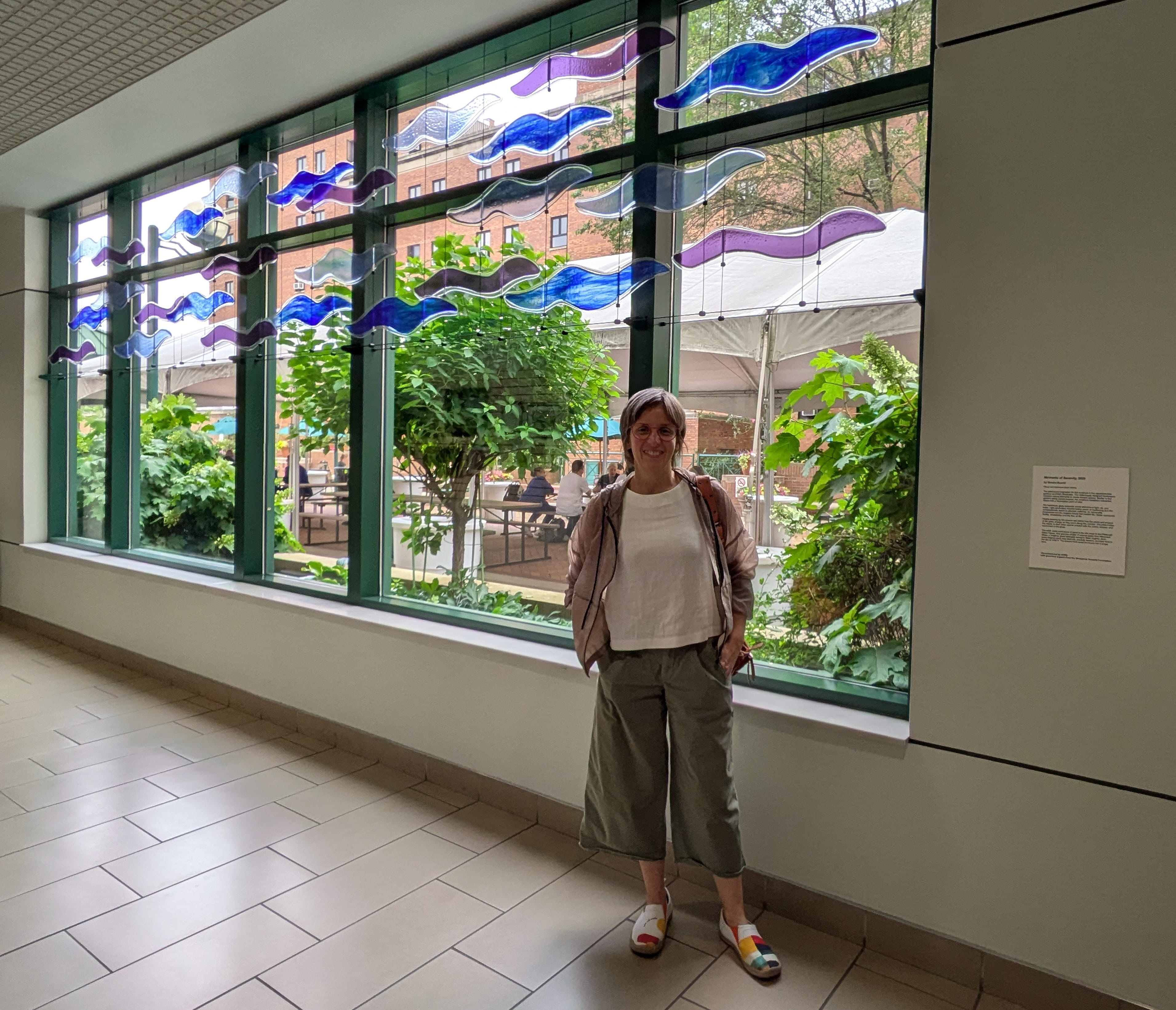 People passing by the artwork will notice how the colors and shapes of the glass change as they move along the corridor. The artist invites the viewer to slow down and be present with the colors, shapes, and movement of the glass.