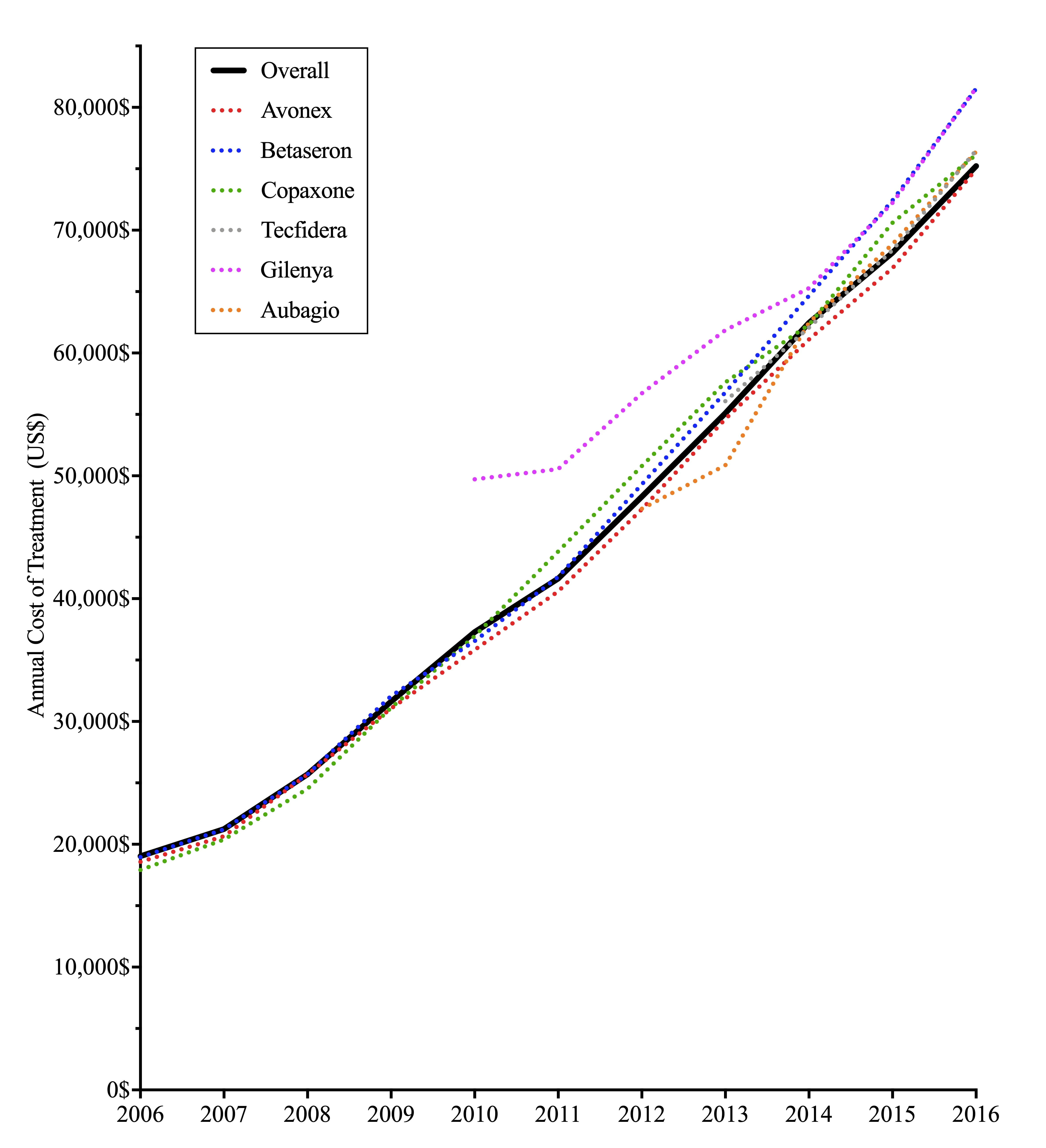 multiple sclerosis drug prices over time. Not only did they find steep increases in list prices — the starting point before rebates, coupons or insurance kicks in — but also in the ultimate costs to both Medicare and its recipients.