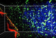 3-D microscopic image of a tumor showing Tregs (green), blood vessels (red) and tumor matrix (blue)