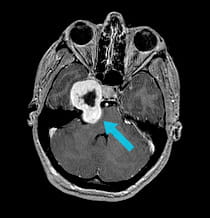 A 17-year-old girl came to the hospital with headaches after a fall. The CT scan and MRI showed a large trigeminal schwannoma at the base of the skull.
